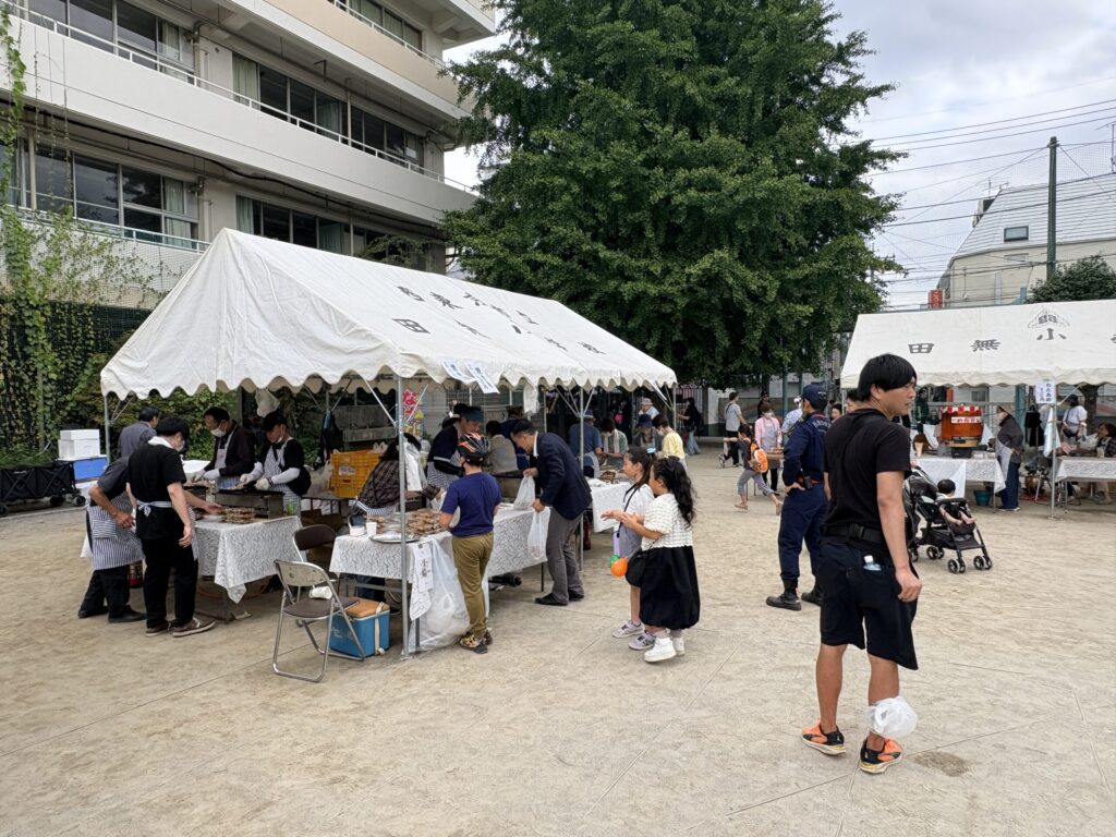 50年以上続くイベントで昨年から田無小学校が会場となりました。昨年は天気が悪く急遽予定を変更して体育館などで行われましたが、今年は晴天に恵まれて校庭での開催となりました。