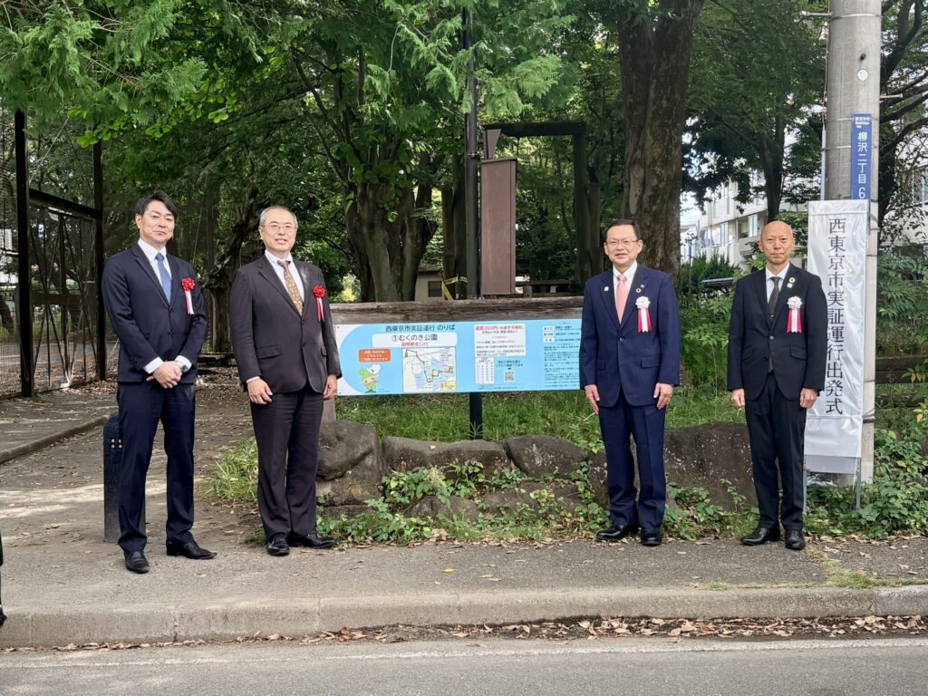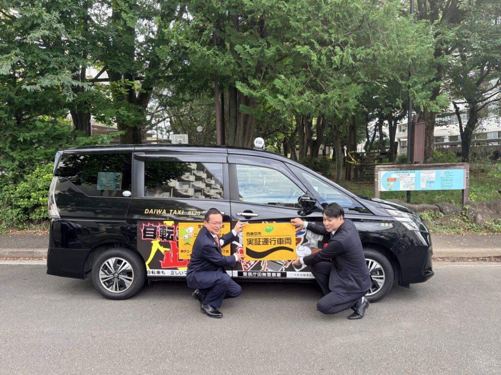 運行初日の10月6日の朝には池澤西東京市長と萱野副市長、そして2台のタクシーの運行事業者である三幸自動車の町田栄一郎社長と大和交通保谷の中村淳社長が参列して出発式が行われ、運行車両に“実証運行車両”と書かれた黄色いマグネットを貼り付けて、第一便の出発を見送りました。