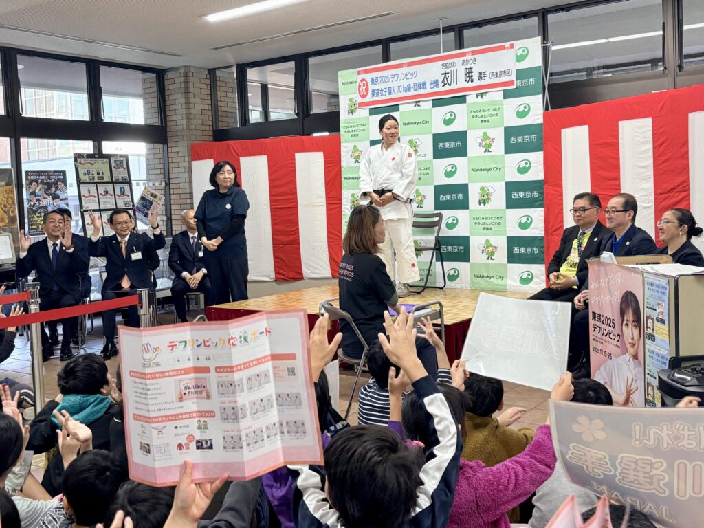 壮行会の会場となった西東京市役所田無庁舎2階ロビーには、田無小学校と向台小学校の児童や市民、市職員などが集まり、柔道着を着た衣川選手が登場すると、開いた両手を顔の横でひらひら回転させる「拍手」を意味する応援の手話で迎えました。