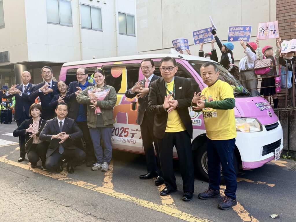 壮行会の後には西東京市役所田無庁舎1階のロータリーで、全国を巡回してきた大会PRのキャラバンカーの出発式が行われ、向台保育園の子どもたちのかわいい声などに応援されて車が出発しました。