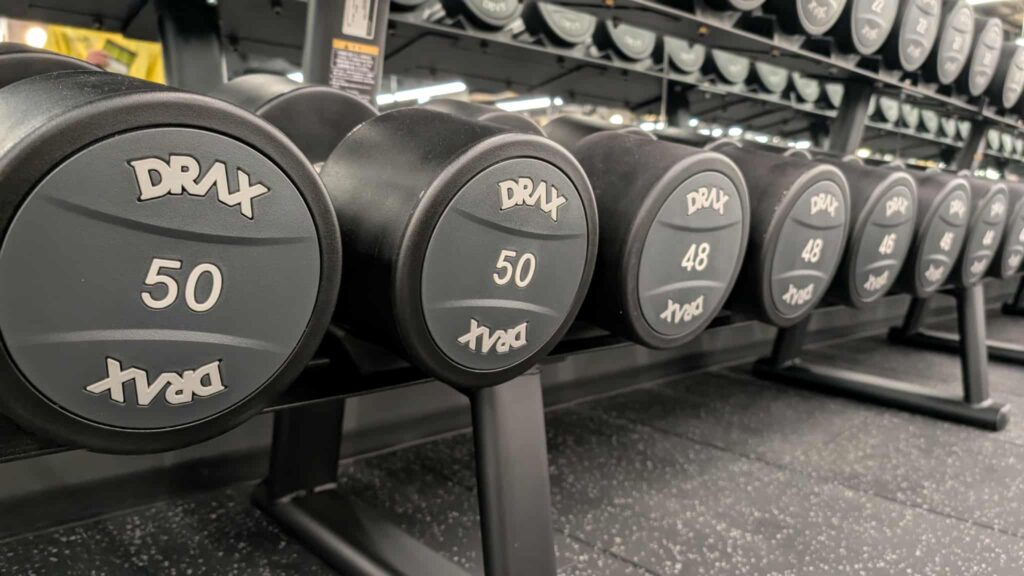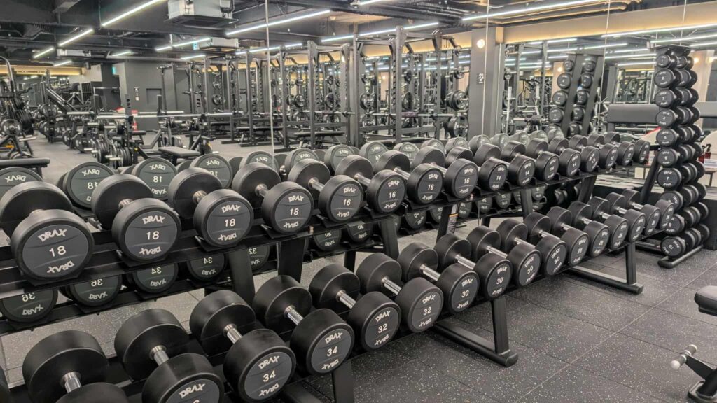 フリーウェイトエリアではダンベルは1kgから50kgまで完備!こんな大きなダンベル初めて見た・・・!