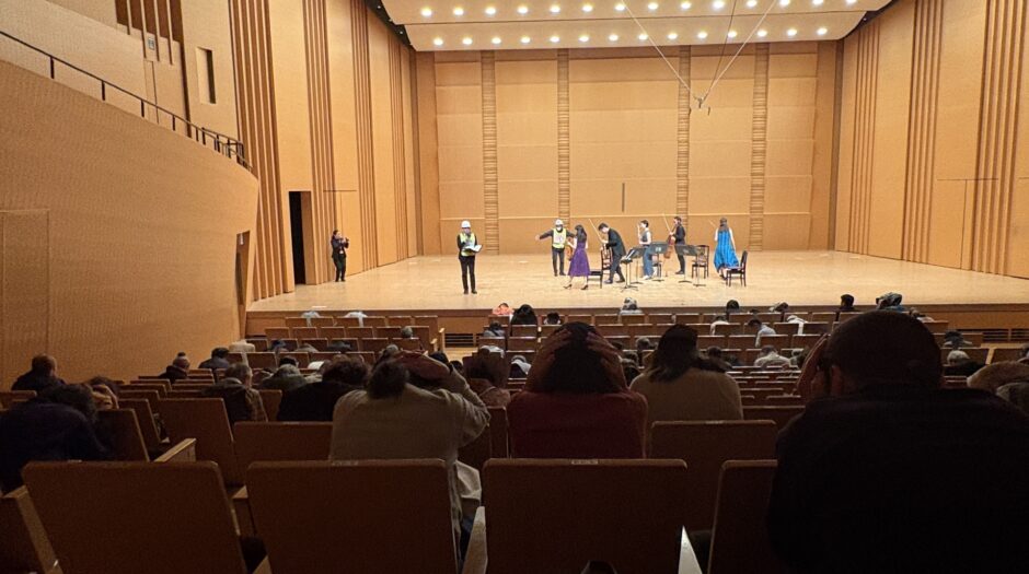 大ホールで管弦五重奏の演奏中に地震を想定した音が急に聞こえてきて、ホールから観客が避難するという訓練です。