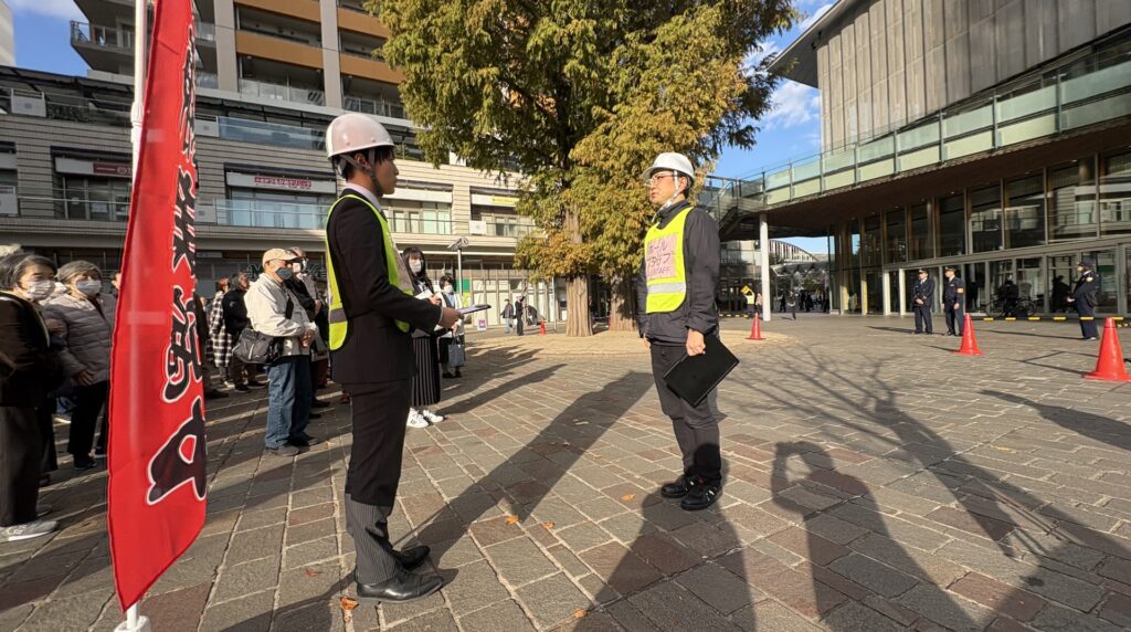 その後、楽屋で火災が発生したという想定で、避難誘導員の指示でそれぞれ近くの扉から出てホール前の広場に避難しました。