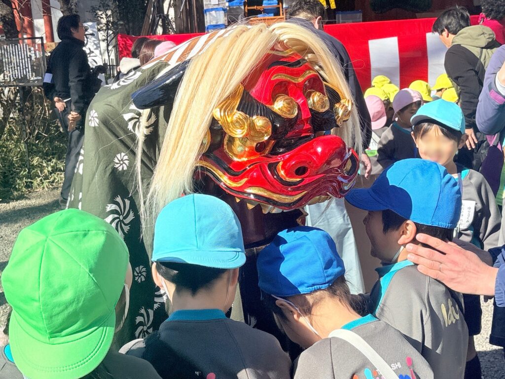 境内には赤鬼、青鬼、緑鬼と獅子が登場。獅子舞では子どもたちの頭にかみつくしぐさを見せ、邪気を払い、無病息災を願いました。