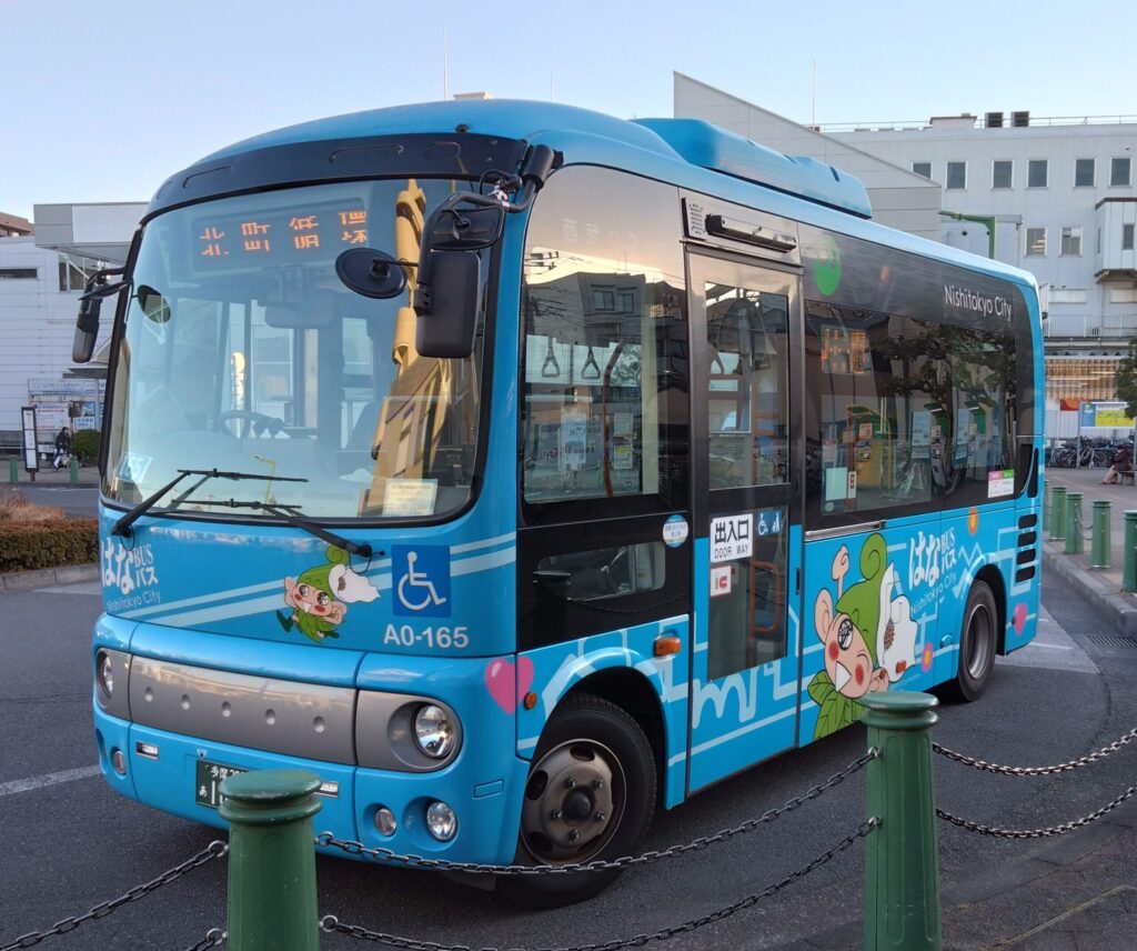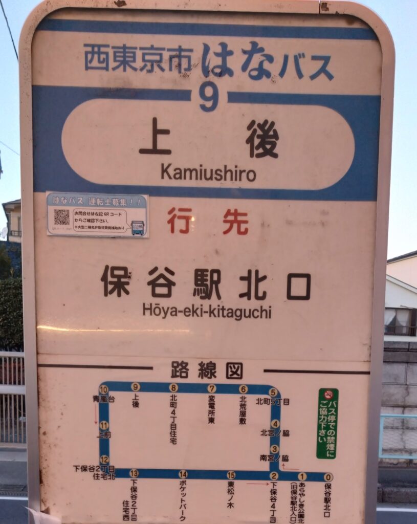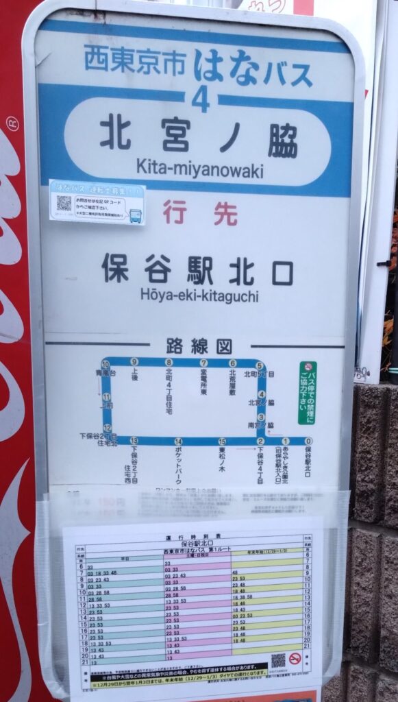 ・はなバス第1ルートは、保谷駅北口を起点に、下保谷・北町地区を時計逆回りで循環します。車両は日野ポンチョのショートタイプ、1扉車を使用しています。停留所は16あります。2つ下の写真(北宮ノ脇停留所)に路線図が出ていますのでご覧下さい。