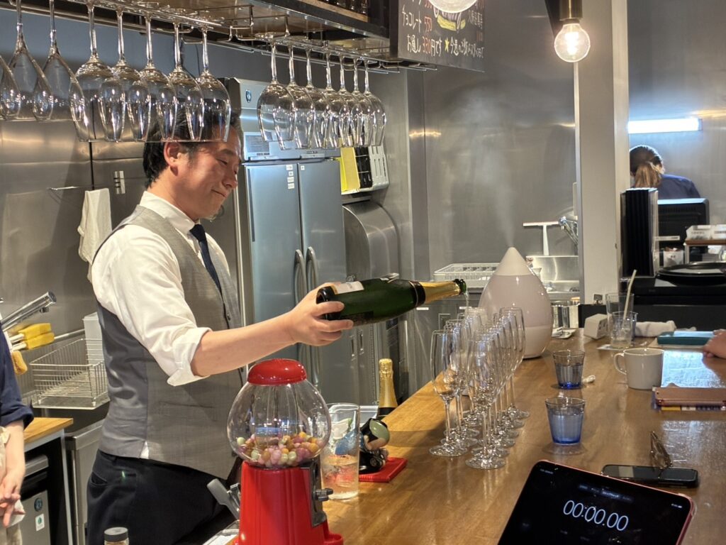 慣れた手つきでシャンパンを注ぐ是枝オーナー。かっこいい・・・(#^^#)(写真左)