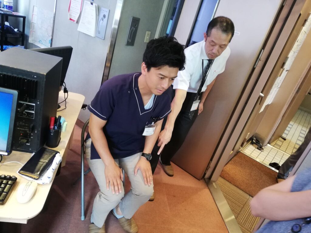 立ち座りの運動で太ももの筋肉を刺激します。お家で間単に出来ますのでぜひお試しくださいね。(実際に体操中の飯泉さん&太ももを指差す菅野さん)