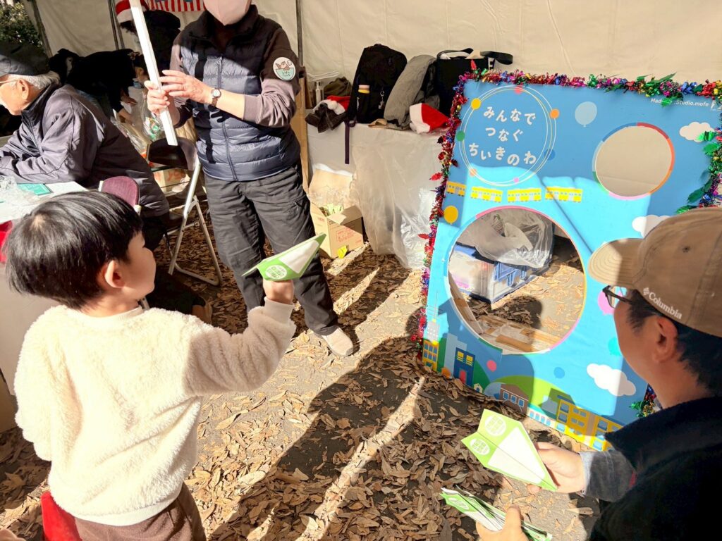 ↑にしにしnet.による紙飛行機チャレンジ。穴に入ったらお菓子をプレゼント!