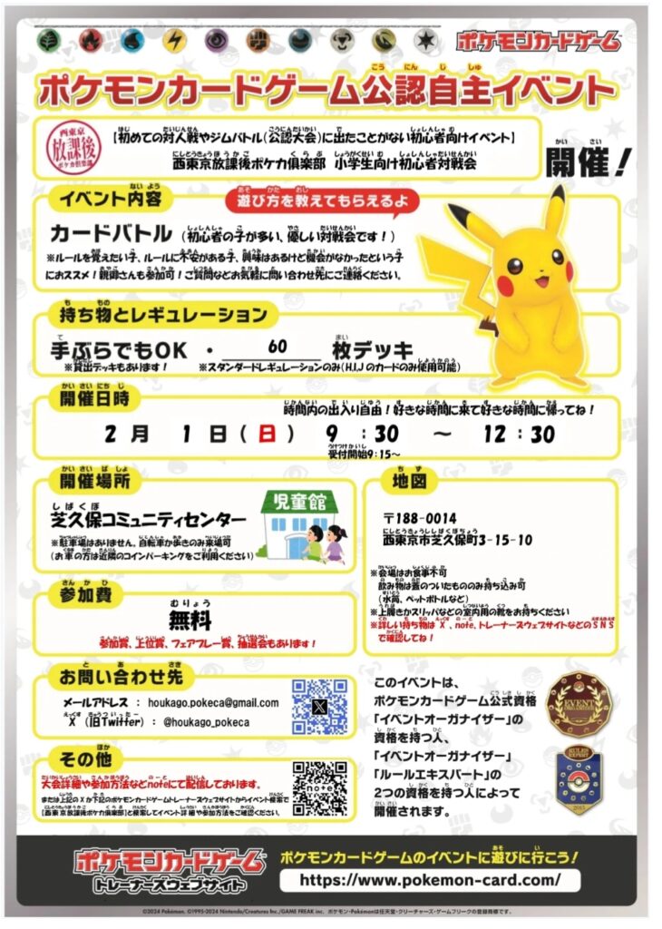 ★西東京放課後ポケカ倶楽部(西ポケ):西東京で小学生以下の初心者向けにポケカ公式公認で対戦会、ルールティーチング(ポケカ教室)のイベントを開催されています。