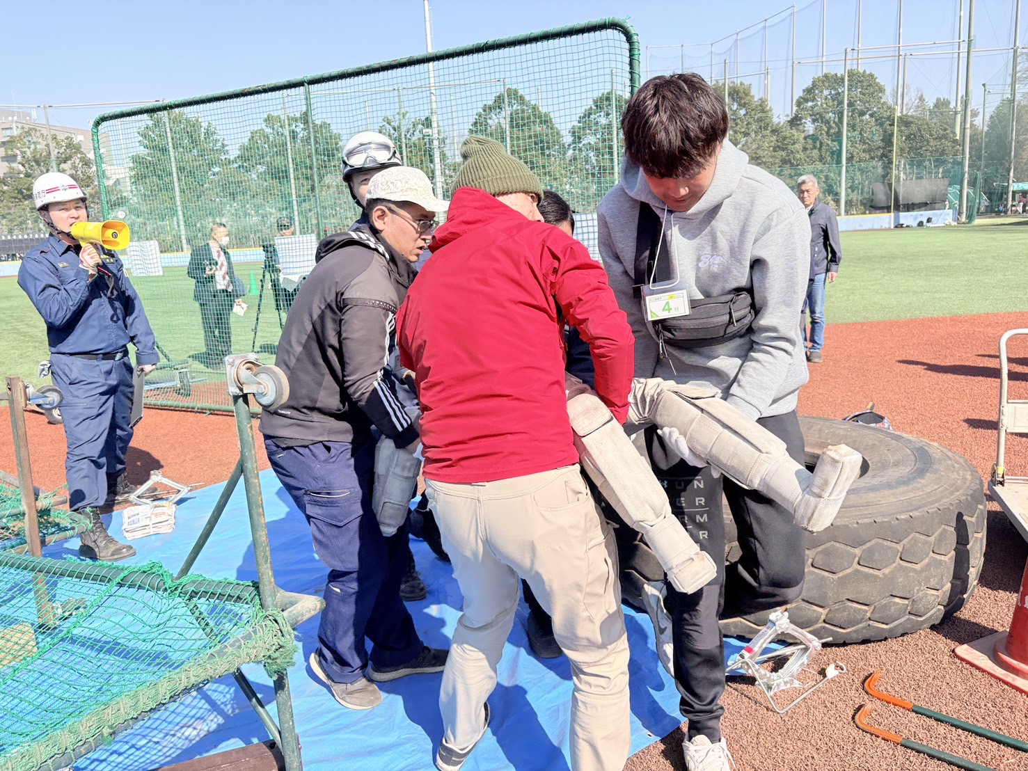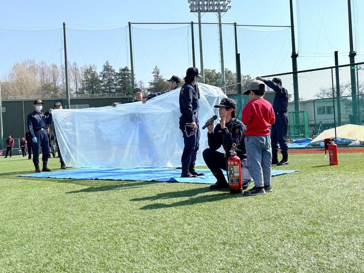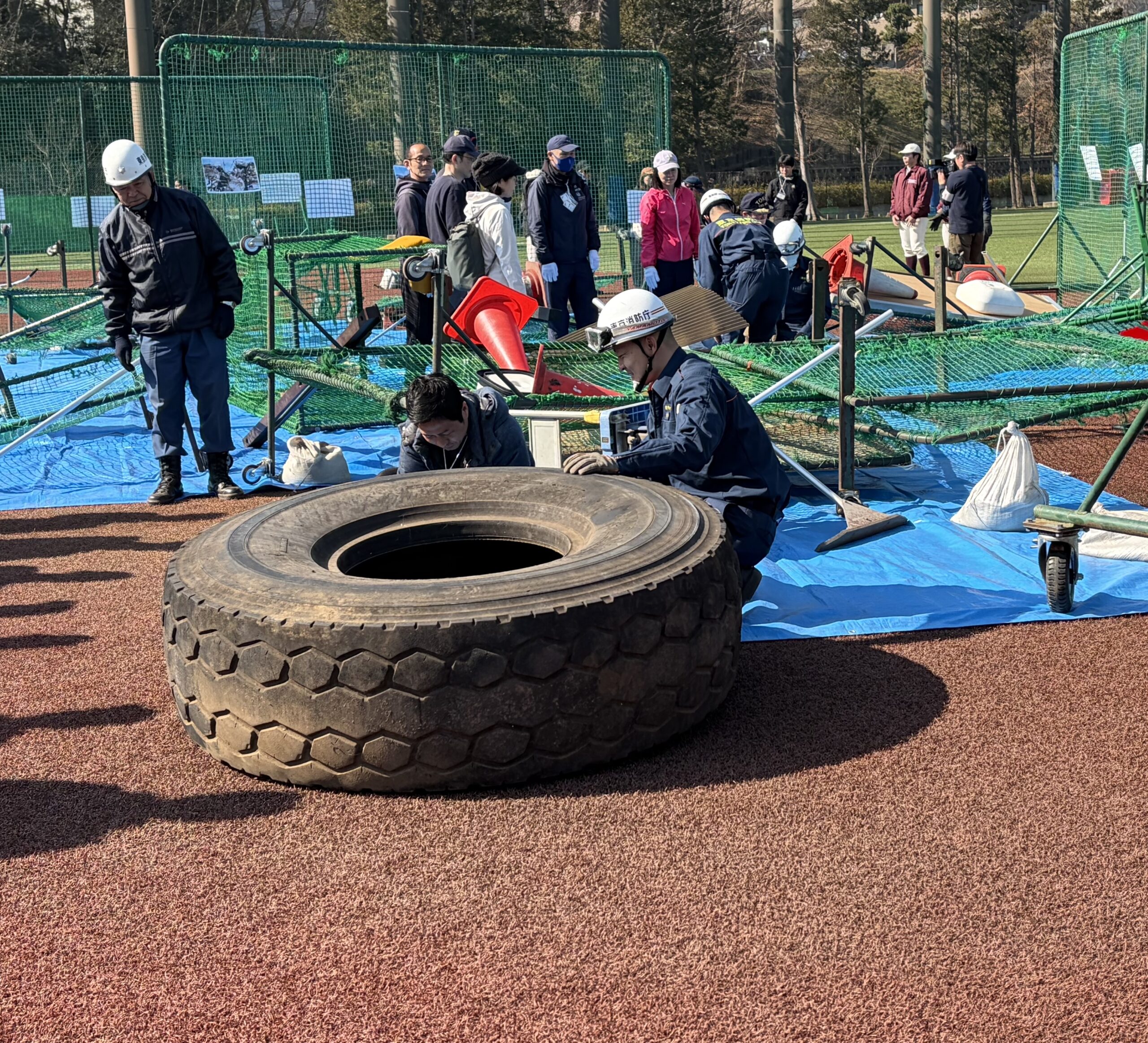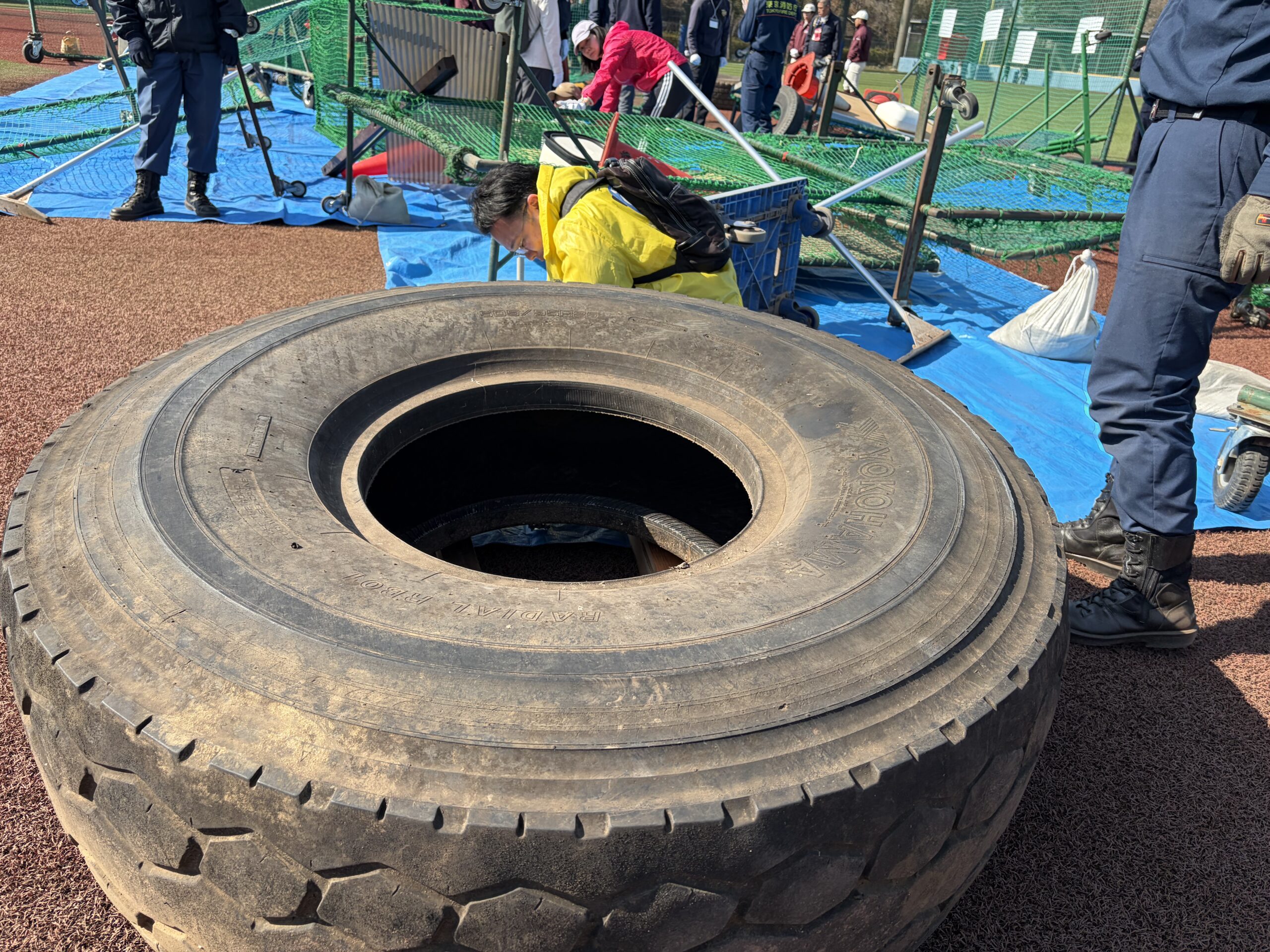 ティーボール体験は子供たちが楽しむイベントですが、その後に始まったリアル防災訓練は大人たちが主役です。