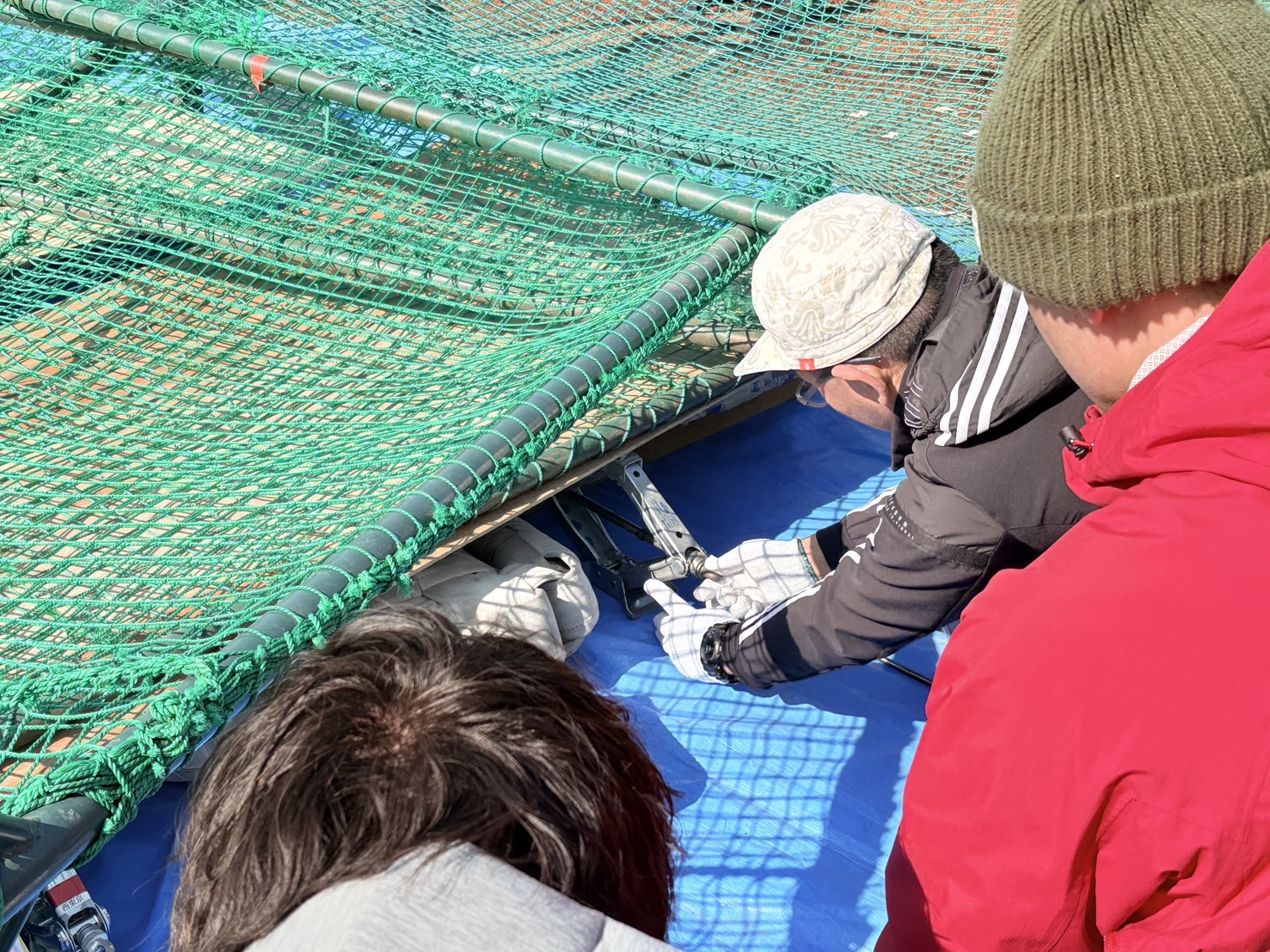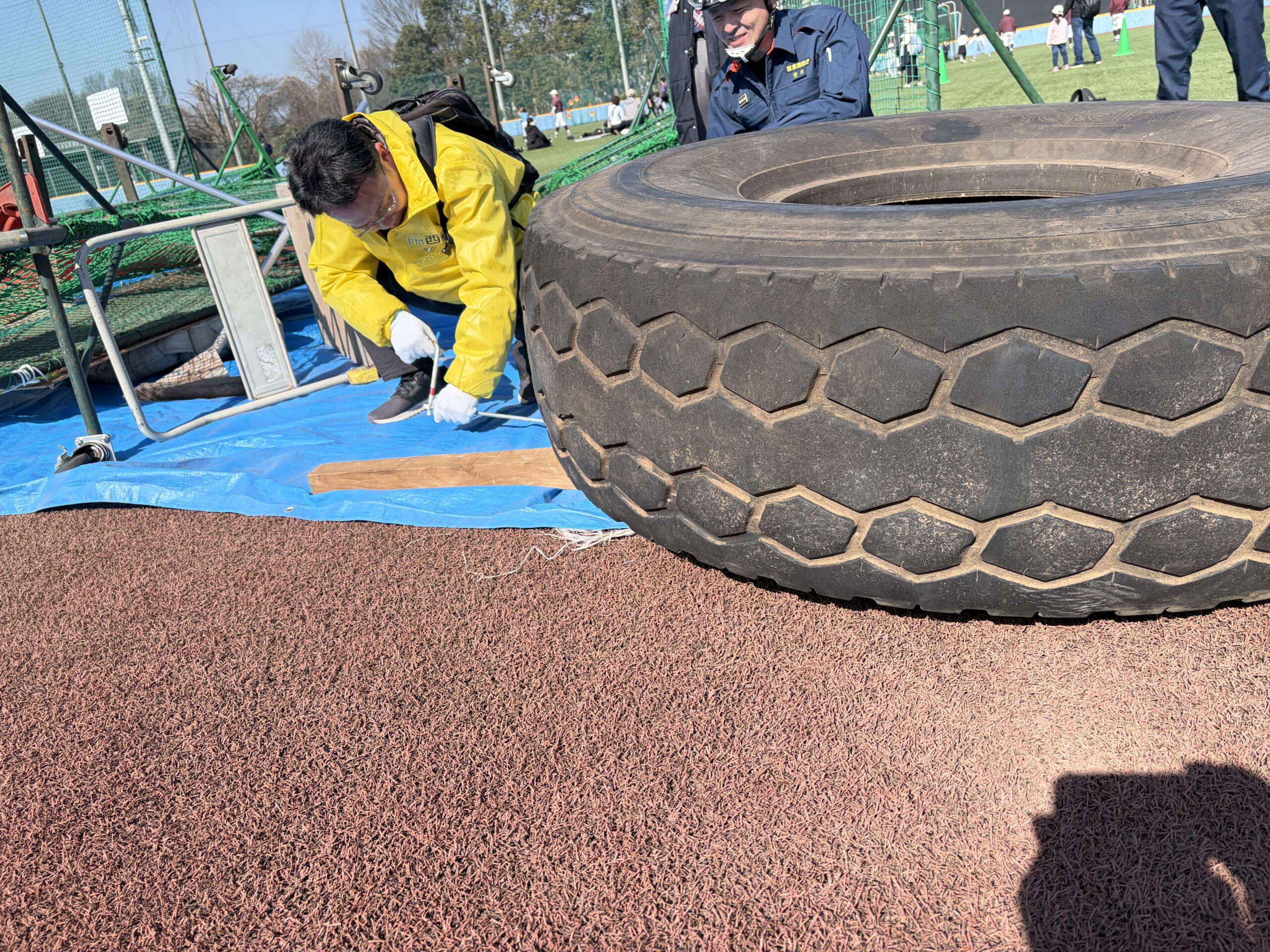 こちらは大きなタイヤを、身近にあるアイテムを使って持ち上げる方法のレクチャー中。