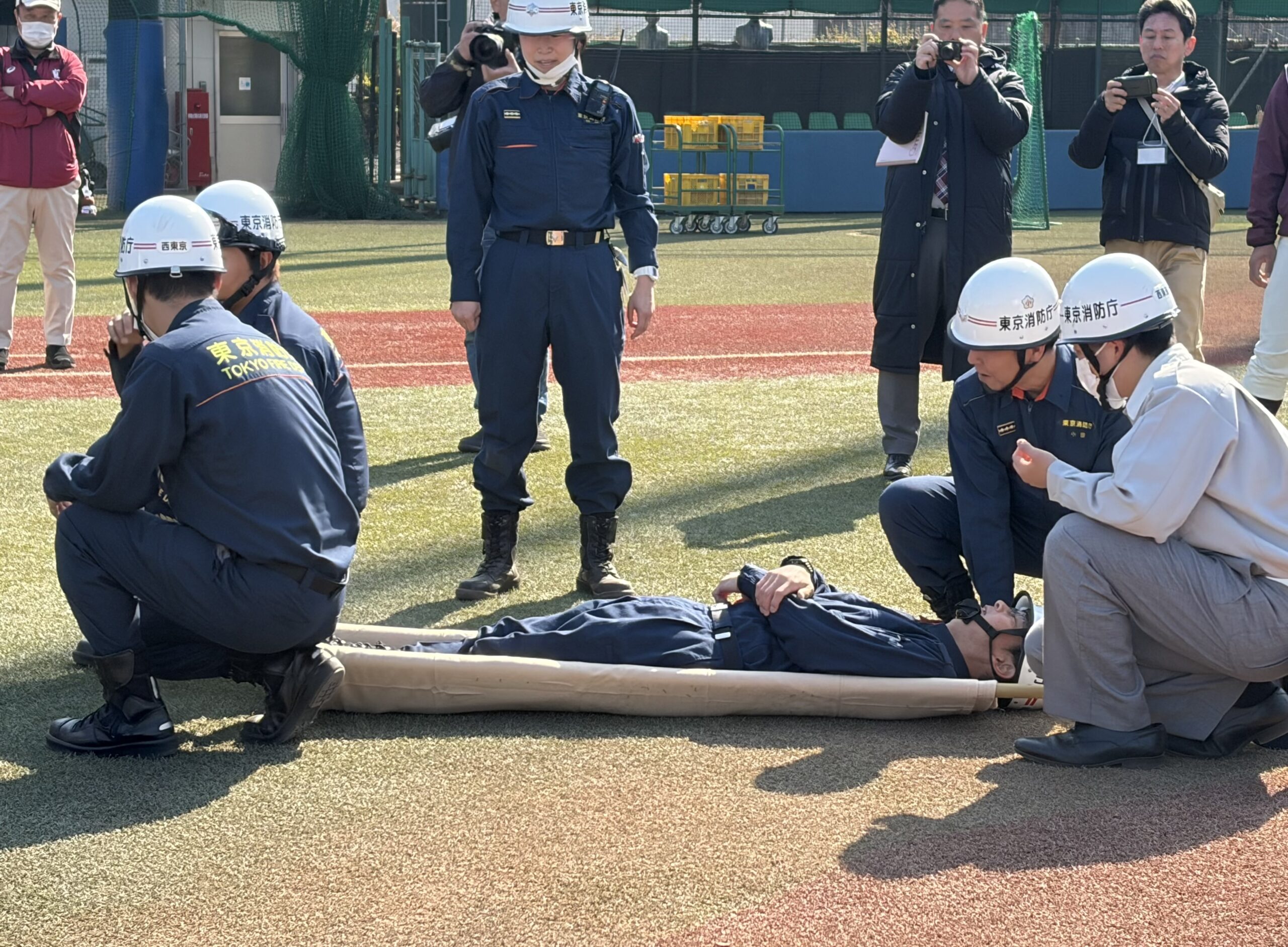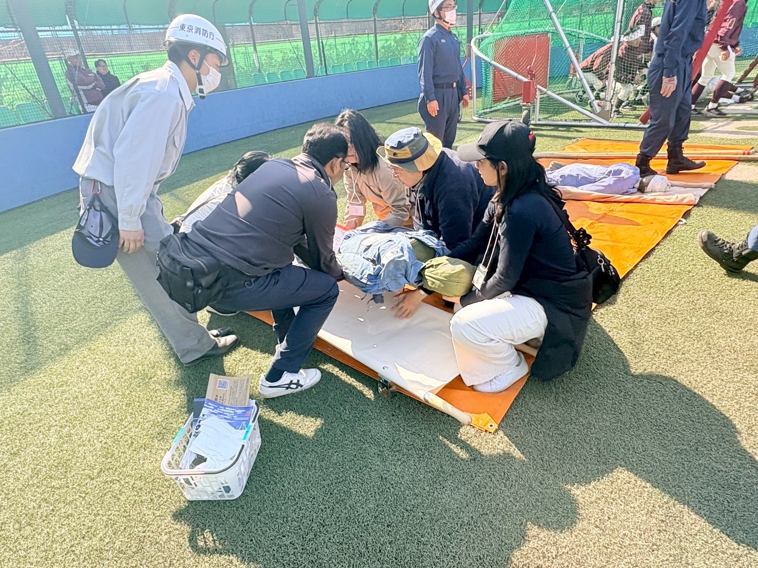 すぐ隣では、怪我人を運ぶ訓練が行われていました。