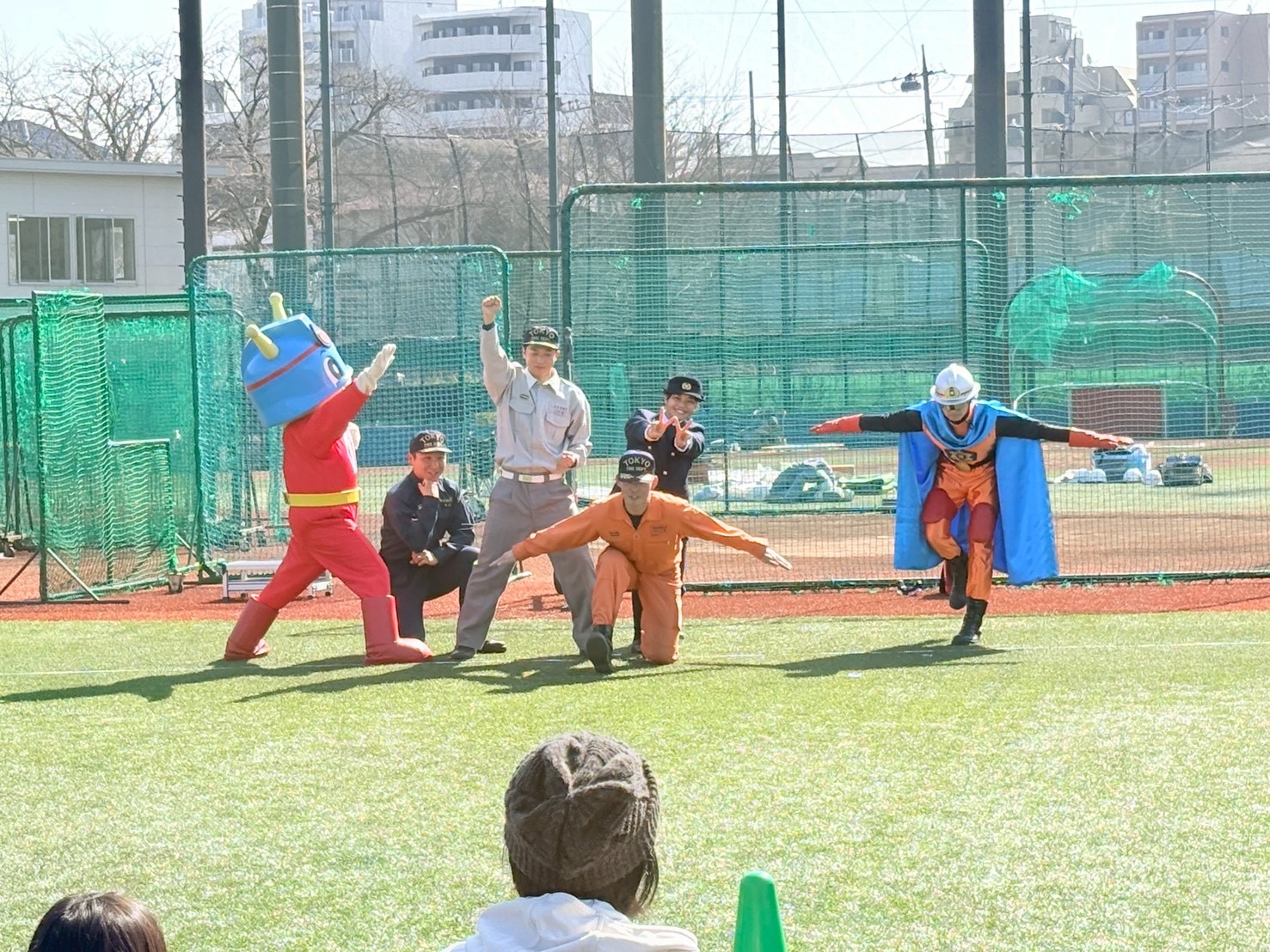 リアル防災訓練が終わって、「ボールを使ったバケツリレー」や「実際の消火器を使った消火訓練」などが行われた後、やってきたのは東京消防庁のマスコットキャラクター•キュータくんと優マークマン。